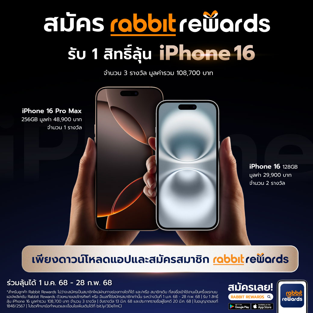 • ประกาศรายชื่อผู้โชคดีในวันที่ 20 มี.ค. 68 ผ่านเว็บไซต์ และเฟซบุ๊คของทาง Rabbit Rewards หรือโทรแจ้งผู้ได้รับรางวัล